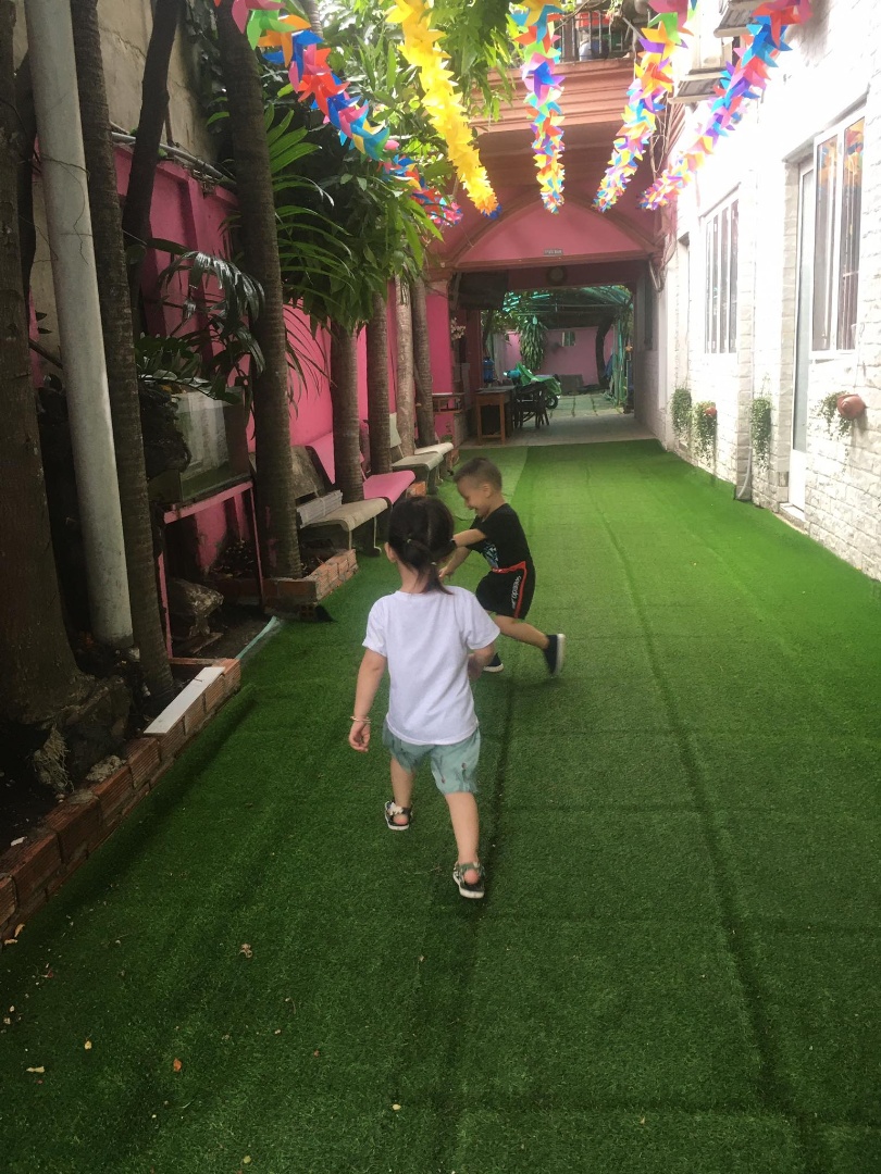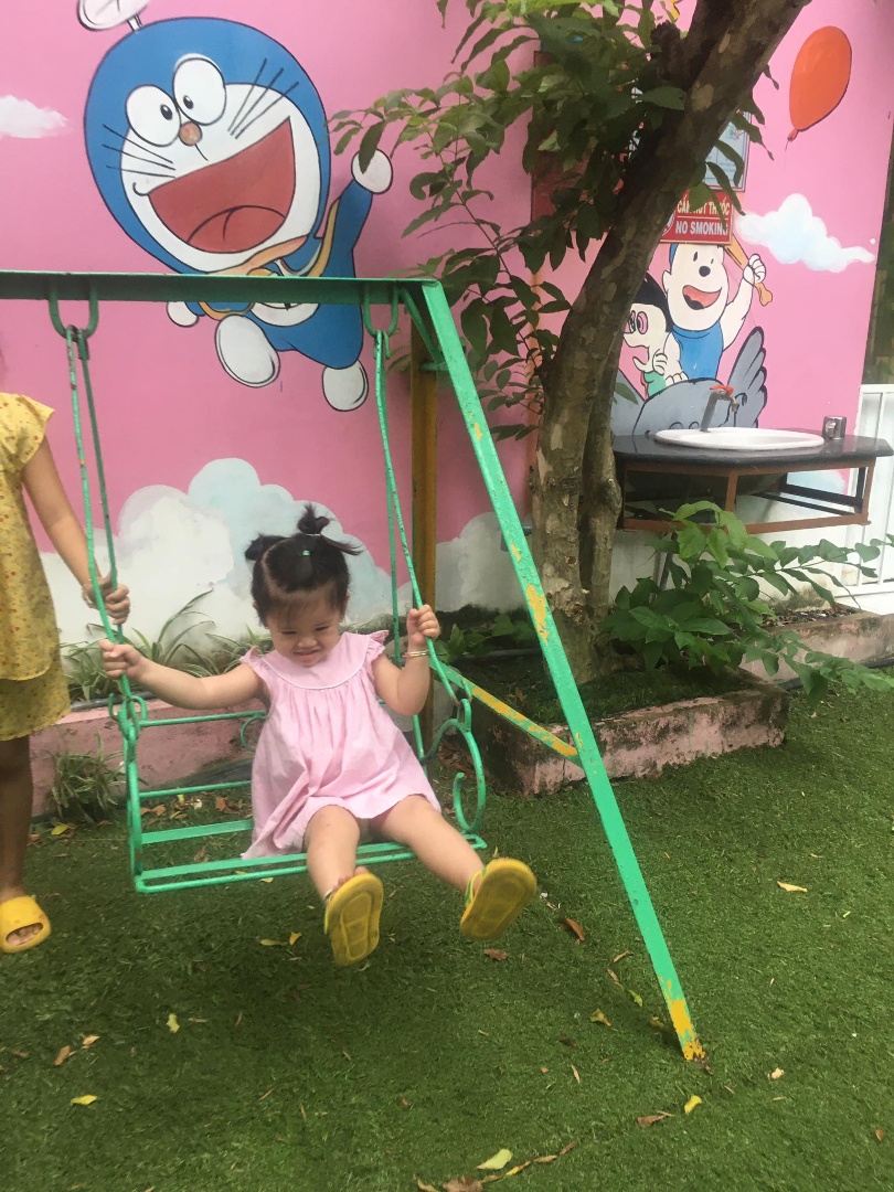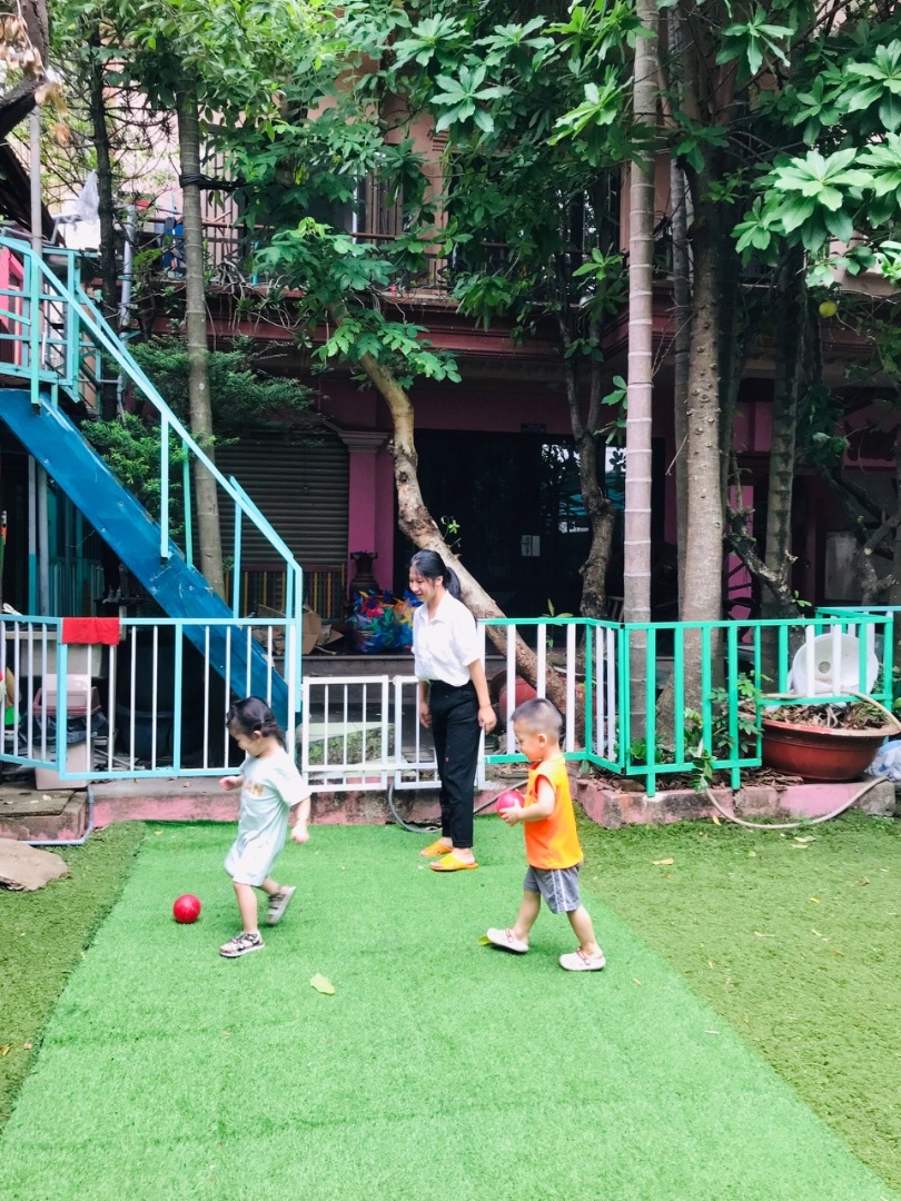 Trường có sân chơi rộng rãi với nhiều trò chơi, cô bếp nấu ăn ngon